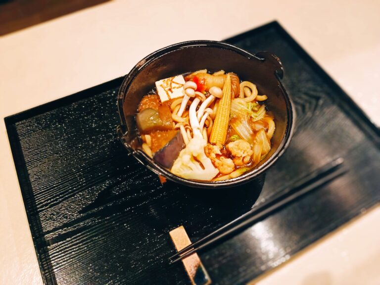 白菜、しめじ、豆腐、ベビーコーン、カリフラワー、揚げナス、しらたきが入ったすきやき風味のうどん。ベジタリアンの方にもおすすめ。 Sukiyaki-flavored udon noodles with Chinese cabbage, shimeji mushrooms, tofu, baby corn, cauliflower, fried eggplant, and shirataki noodles.Recommended for vegetarians.